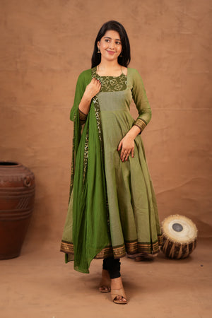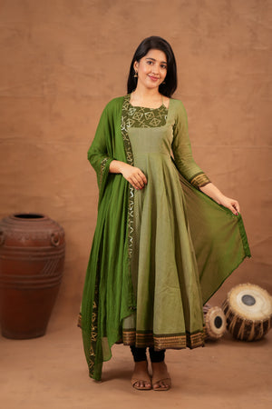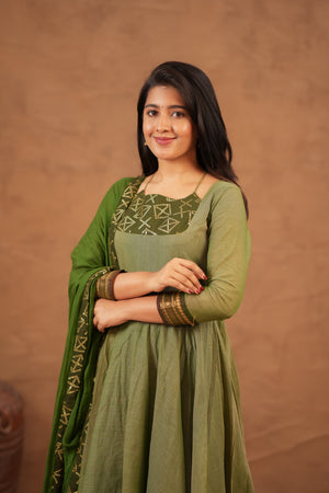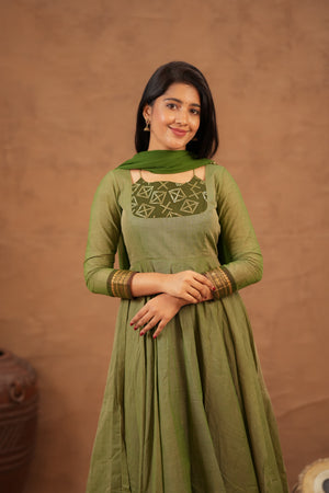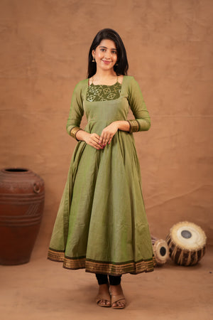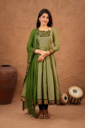 Step into timeless elegance with our Abinaya Collection, crafted in breathable cotton and paired with a lightweight chiffon dupatta for that flowy, festive look. The rich olive tone, traditional border, and classic flare make it perfect for: