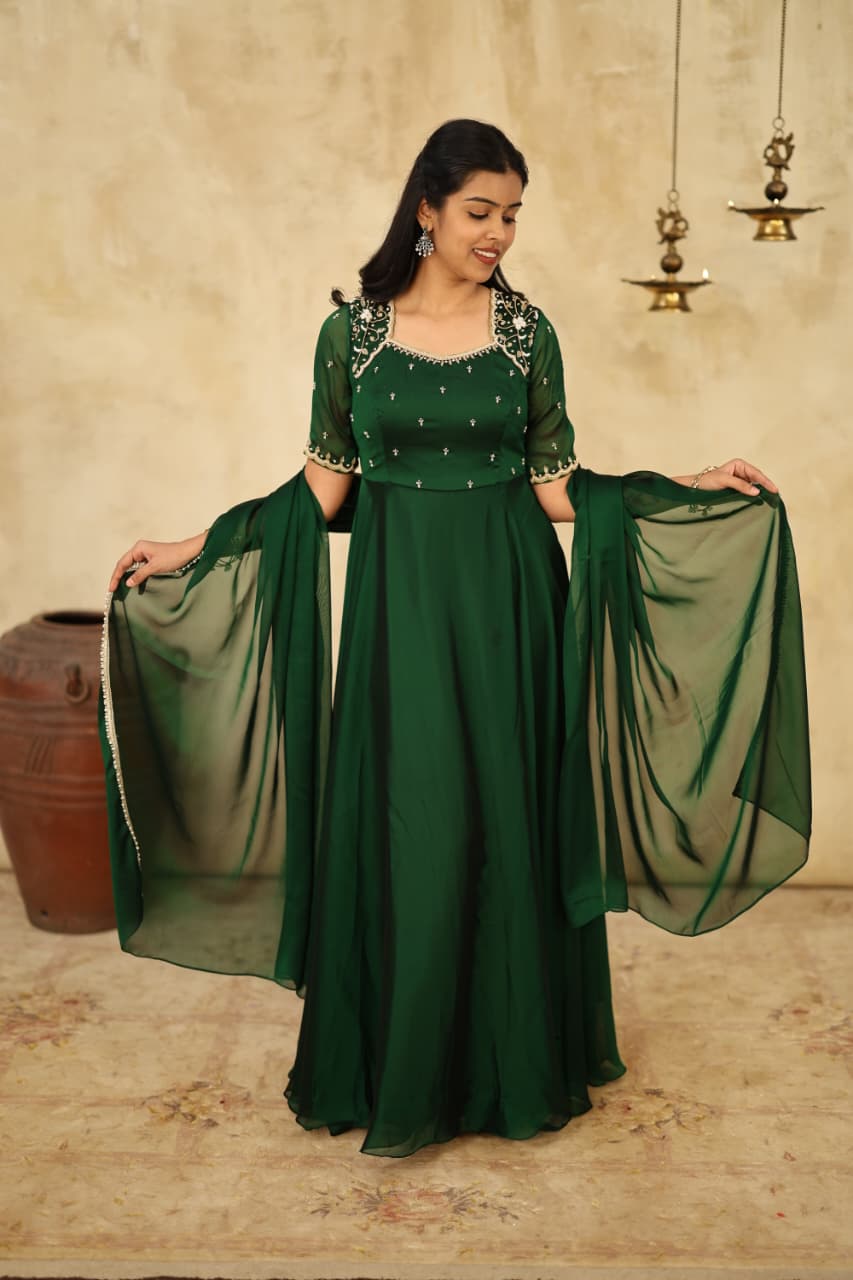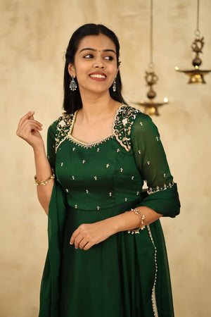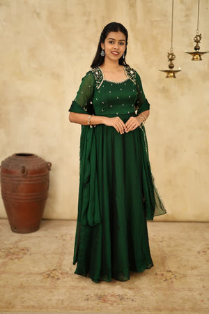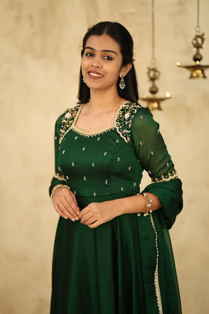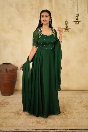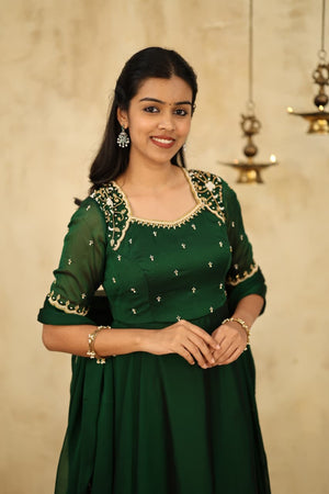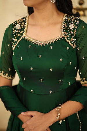 Step into elegance with our Aditya Collection. This luxurious deep green Anarkali is tailored in shiny georgette, giving it a graceful fall and a soft shimmer that makes you stand out. The yoke and sleeves are beautifully adorned with delicate hand-embroidered details, adding a royal charm to the outfit.