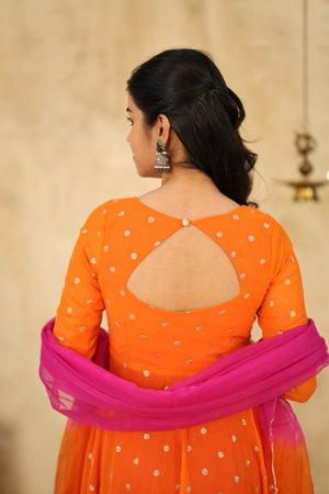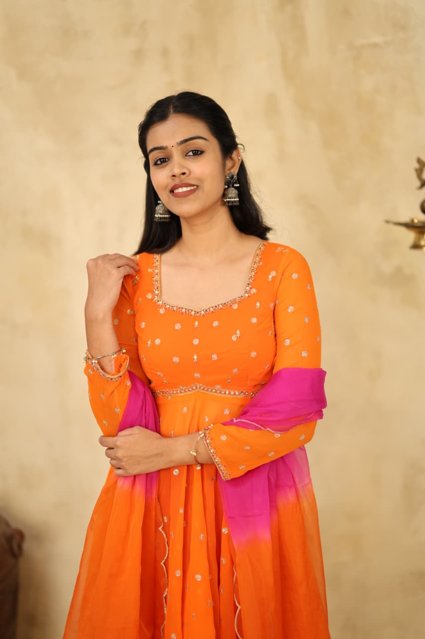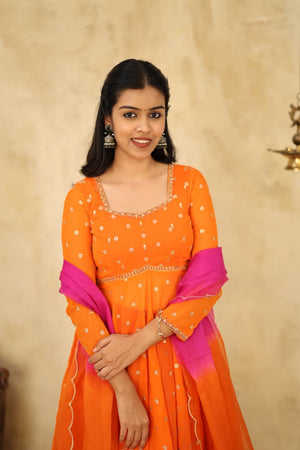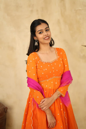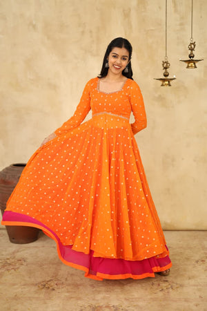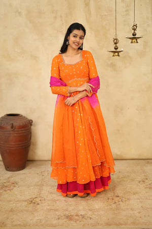 Crafted in a radiant orange hue, this top features delicate hand embroidery with traditional motifs. The fitted bodice and flowy flare highlight elegance while ensuring comfort throughout festive celebrations.