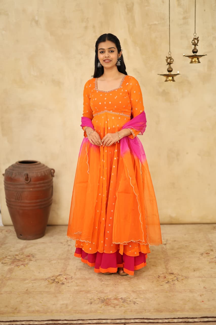 Paired with a vibrant pink georgette skirt, adding richness and a graceful fall. The contrast shade creates the perfect festive vibe with a twirl-ready silhouette.