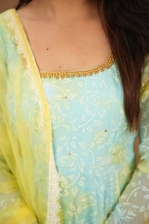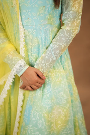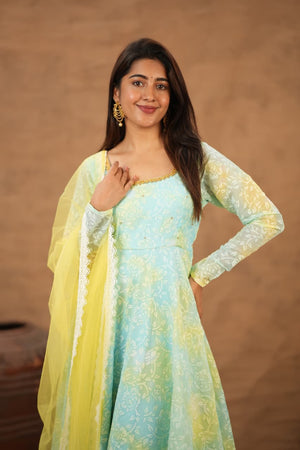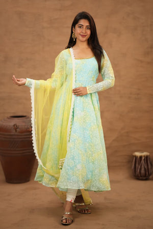 Designed in a flattering flared silhouette, this outfit flows beautifully with every step. It comes paired with a graceful net dupatta that enhances the overall look with a soft, dreamy finish.