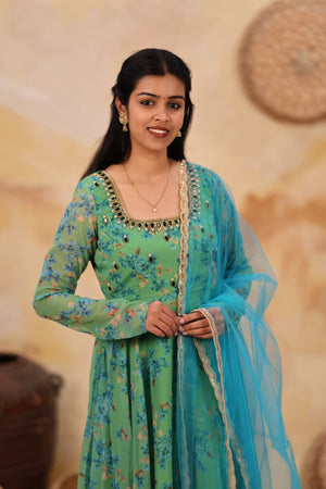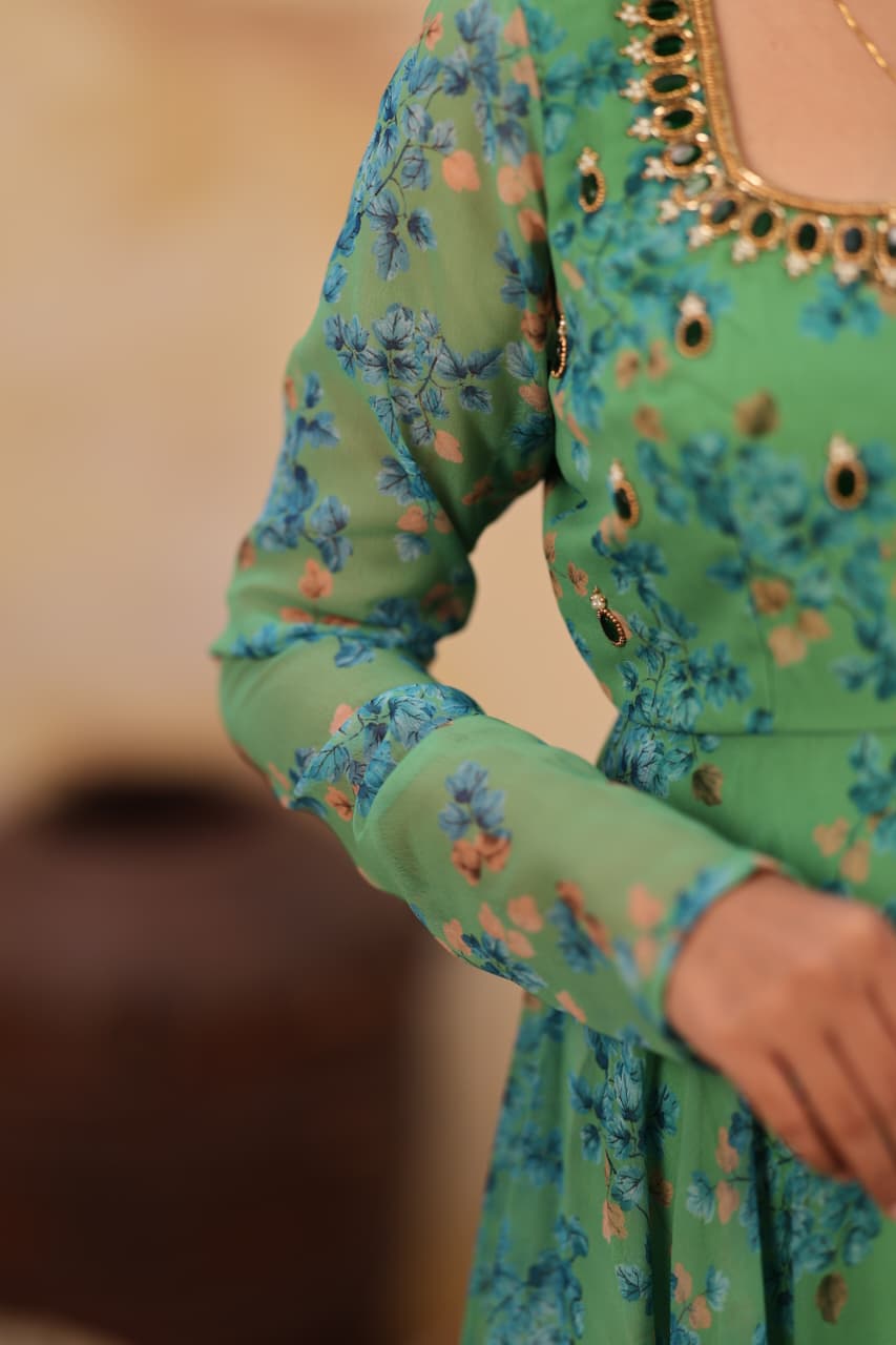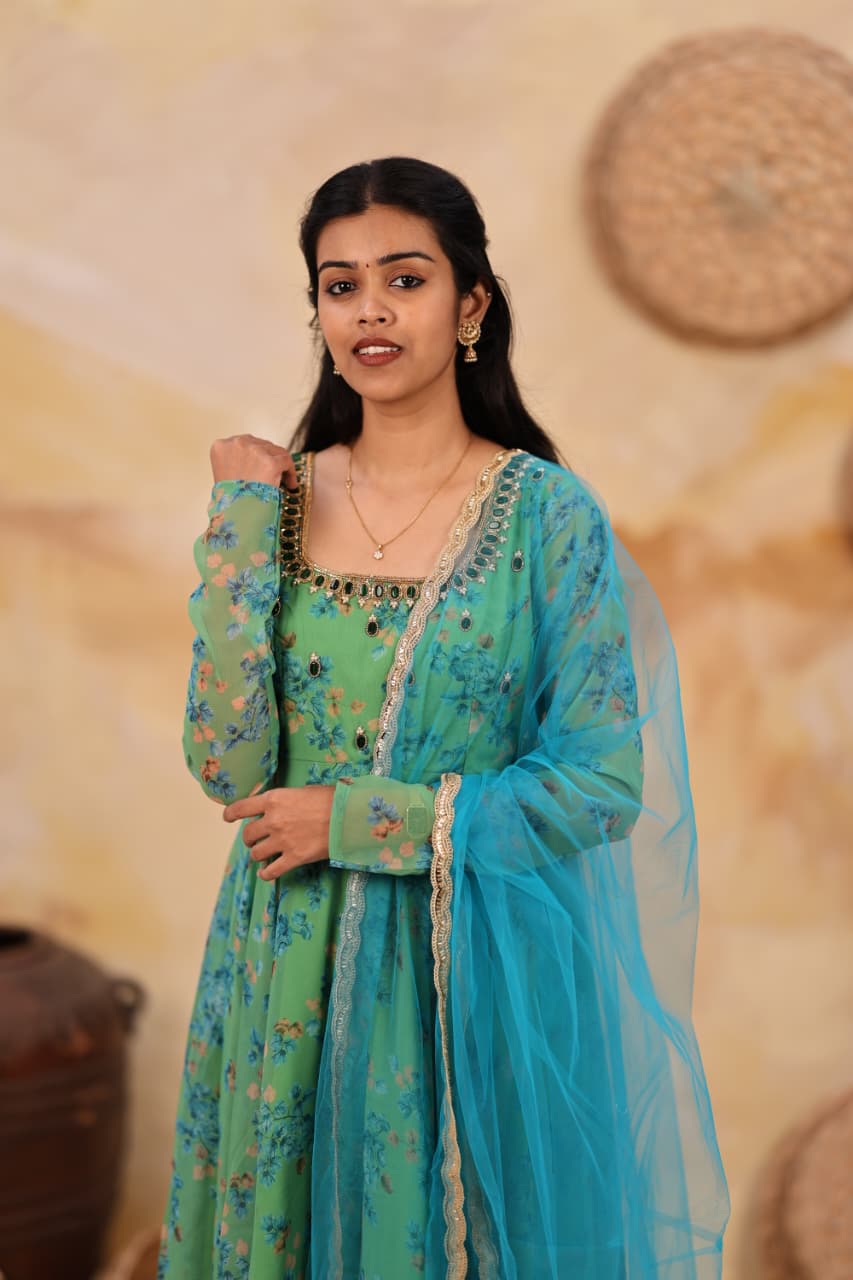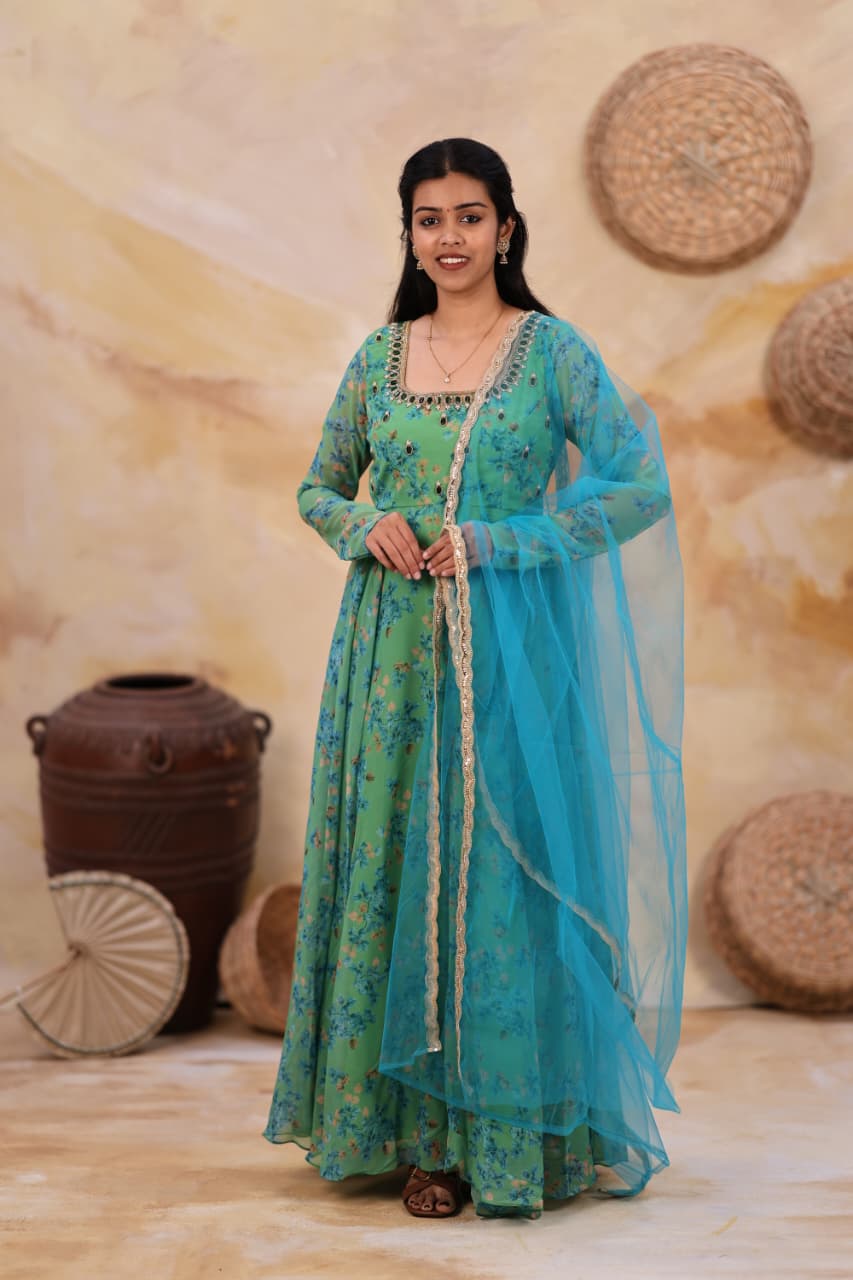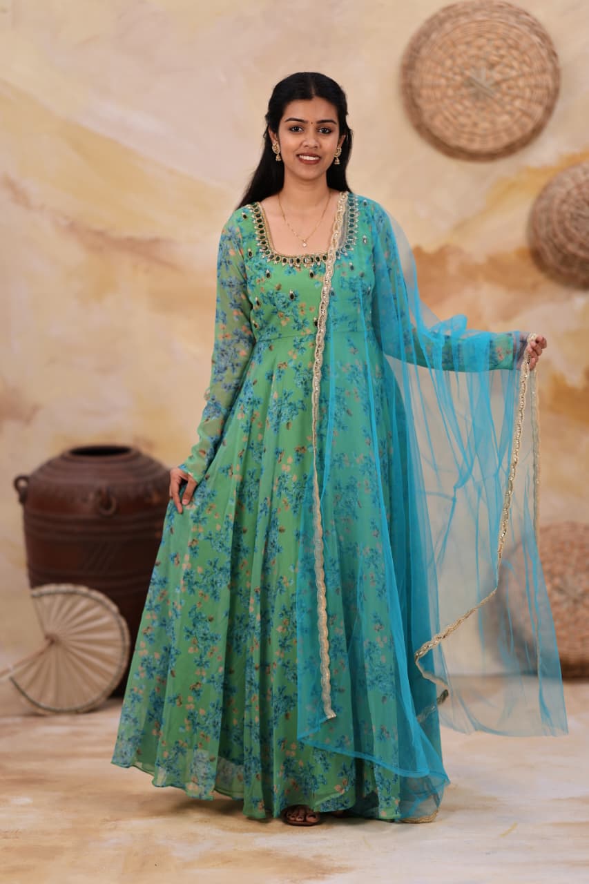 A mesmerizing piece crafted from floral georgette fabric, blending comfort and elegance in every swirl. The vibrant floral prints create a refreshing look, while the intricate handwork along the neckline and sleeves adds a rich, festive charm. The long flared silhouette beautifully enhances your grace, making it perfect for any occasion.