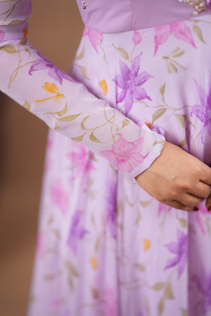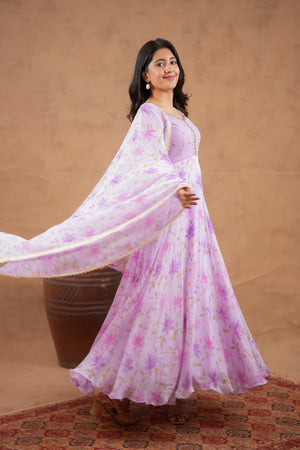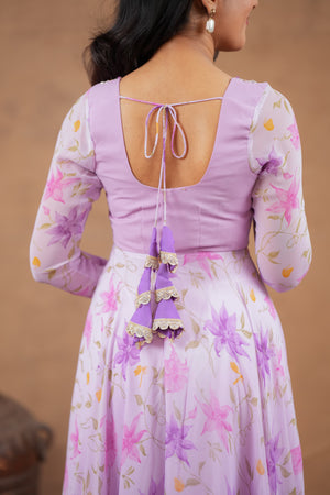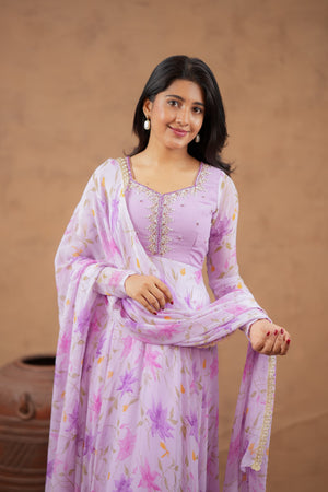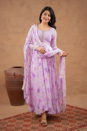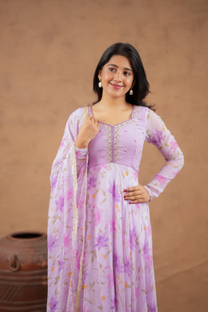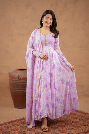 With its soothing lilac tones and blooming floral patterns, this outfit is perfect for daytime festivities, engagement ceremonies, mehendi functions, or even a graceful temple visit. The full-flared silhouette adds charm to every step, while the matching dupatta with lace detailing completes the look with finesse.