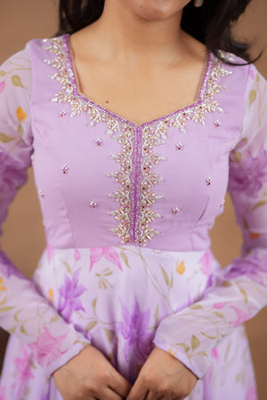 Step into elegance with our newest arrival — the Fiore Collection, a dreamy Anarkali crafted from soft floral georgette fabric and beautifully detailed with delicate hand embroidery along the neckline and yoke.