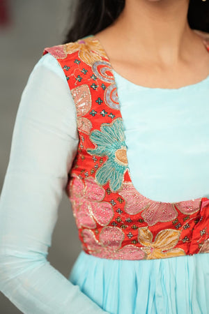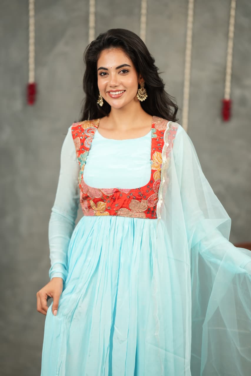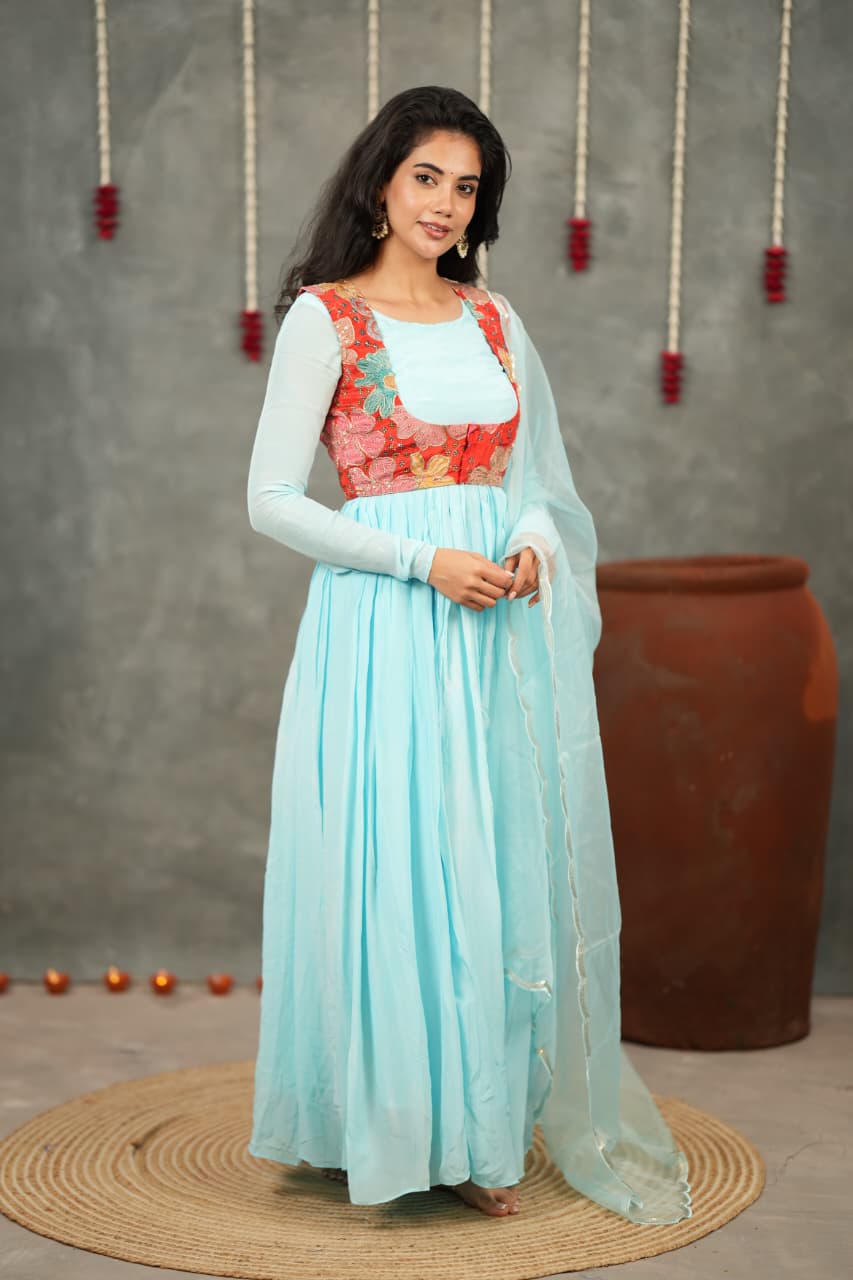 The Hanvika Collection is crafted using pure natural crape, giving the dress a soft flow and luxurious comfort. The highlight of this ensemble is the beautifully designed embroidery jacket, adding a rich festive touch and enhancing the overall silhouette.