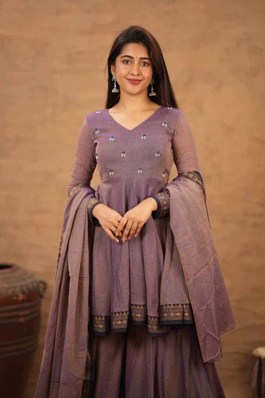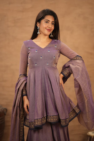 Featuring a flowy flared sharara paired with a gracefully tailored kurta and dupatta, this set enhances movement while maintaining a soft, feminine silhouette. The delicate handwork elevates the overall look without overpowering its simplicity.