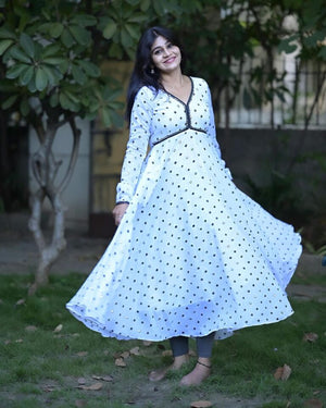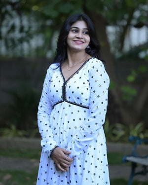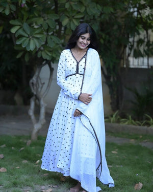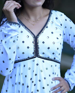 White bandhani pure cotton mirror work Anarkali paired up with white Georgette dupatta