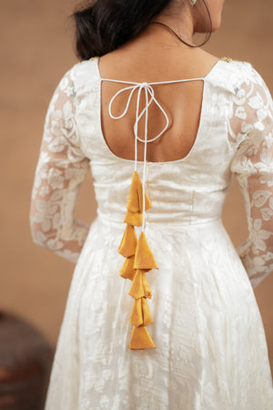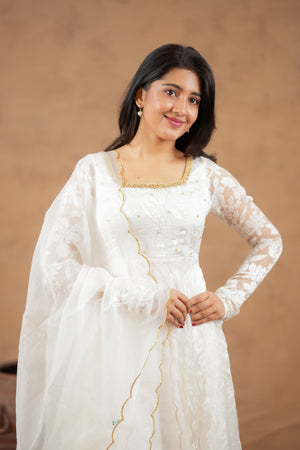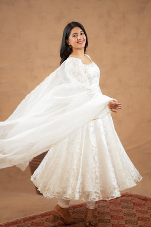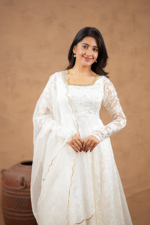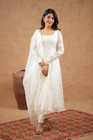 Fabric: Brosso with Organza Dupatta | Colour: Ivory White | Work: Minimal Handwork | Fit: Flared Anarkali | Washing: Gentle hand wash or dry clean recommended