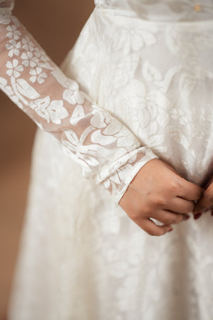 Crafted from luxurious brosso fabric with subtle floral textures, the Nila Collection exudes timeless elegance. Adorned with minimal handwork for a graceful shimmer and paired with a lightweight organza dupatta, this look is the definition of soft sophistication.