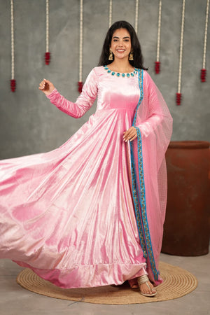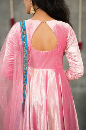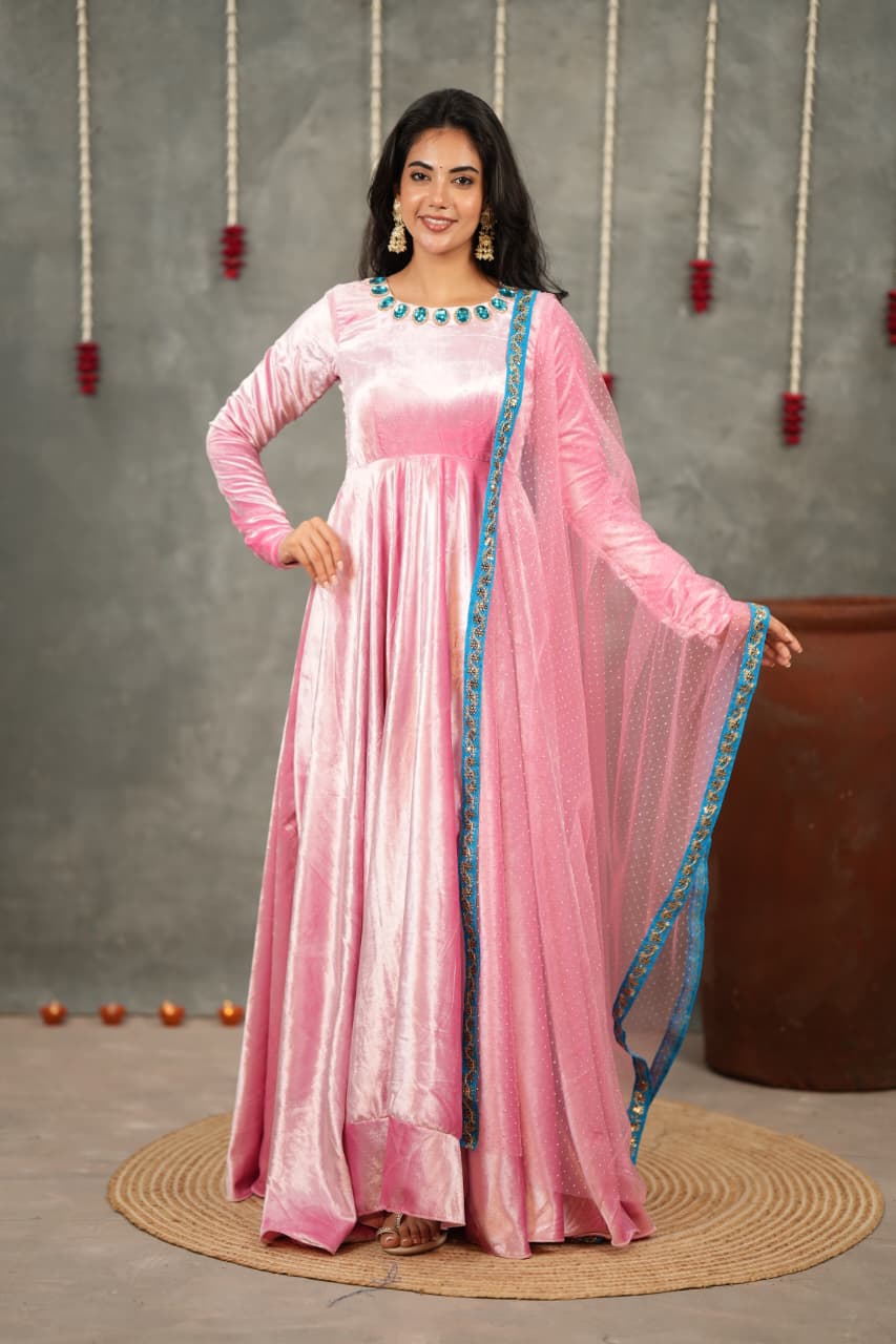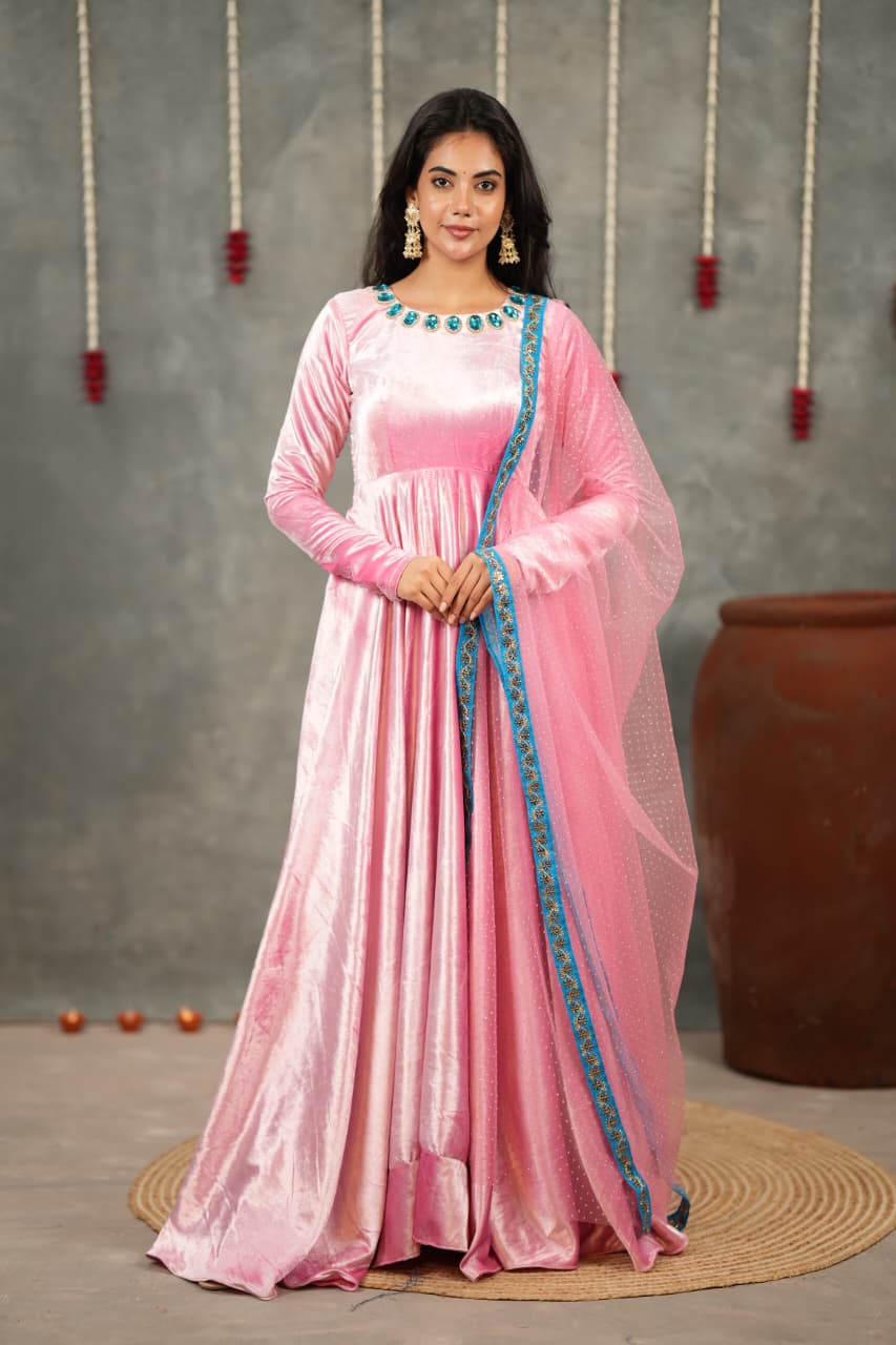 Crafted from rich pure velvet, this Anarkali flows beautifully with a soft sheen that adds royal charm to every movement. The minimal handwork detailing enhances the neckline subtly, keeping the look elegant, classy, and timeless.