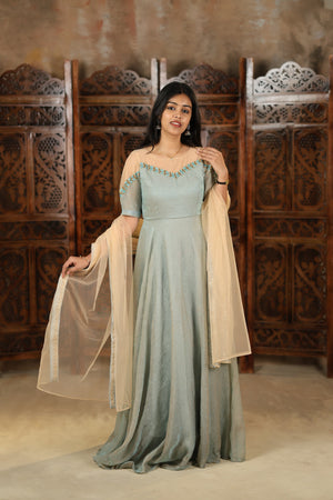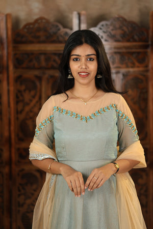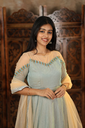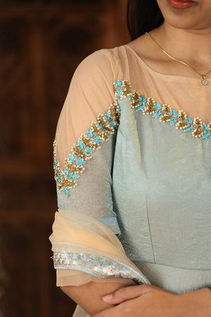 Grace meets elegance in our latest Nivetha Collection – a dreamy ensemble crafted from premium crushed georgette fabric that flows beautifully with every step. The soft pastel shade enhances your natural charm, while the handcrafted detailing across the neckline and sleeves brings in a subtle yet sophisticated sparkle.