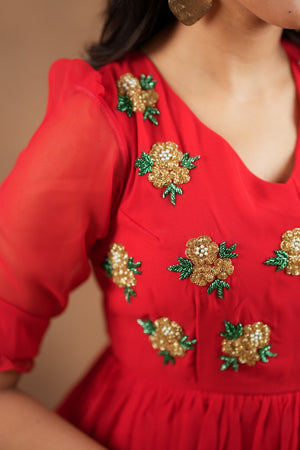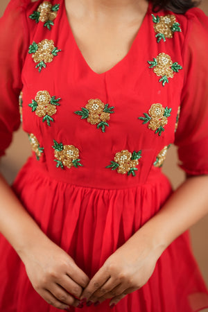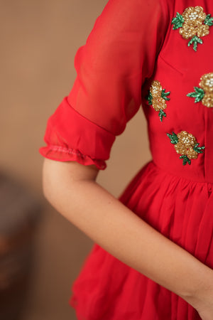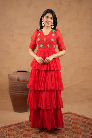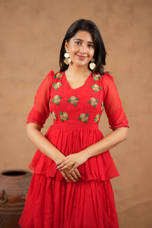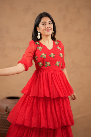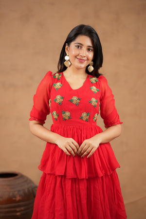 Step into timeless charm with our Rachel Collection, a radiant red ensemble crafted from soft and flowy georgette fabric. The upper bodice features intricate handwork embroidery, adding a touch of luxury and traditional finesse to the modern silhouette.