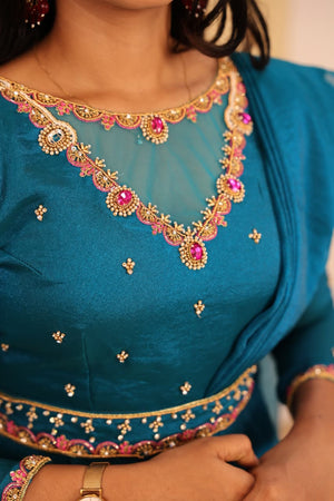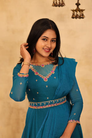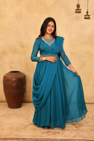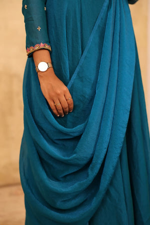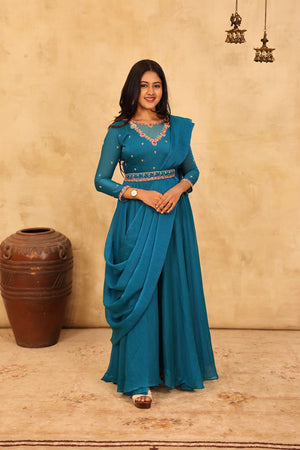 Step into effortless elegance with Rukmini – Premium Designer Drape Wear in a stunning royal blue hue. Crafted from luxurious satin-georgette, this ready-to-wear drape redefines modern sophistication with traditional grace. The fluid silhouette, intricate pleating, and hand-embellished detailing make it perfect for weddings, festive occasions, or cocktail evenings.