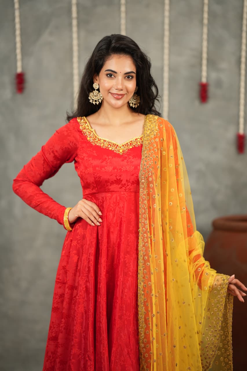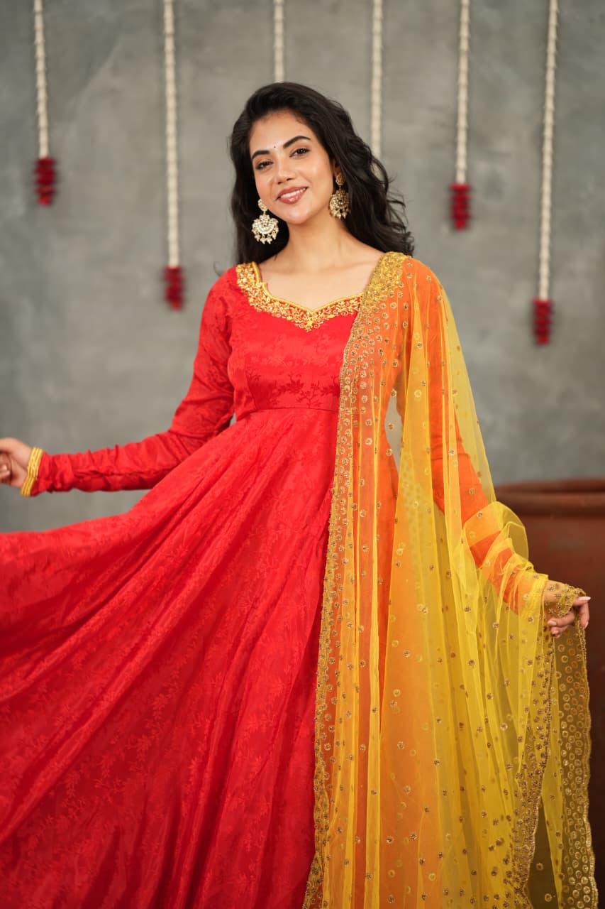 An elegant blend of tradition and modern charm — the Sanvika Collection is crafted from rich crape self-design fabric that flows gracefully with every step. The vibrant contrast net dupatta with delicate embellishments adds a festive sparkle, making this outfit a perfect choice for any celebration.
