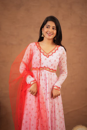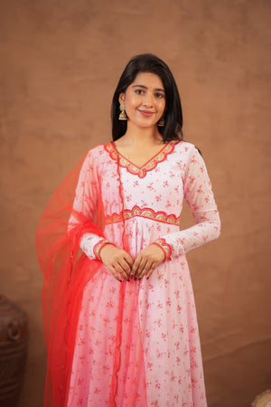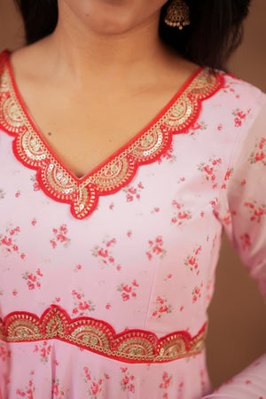Crafted in soft pink floral fabric with delicate detailing, this full-length Anarkali brings a graceful flow to every step.