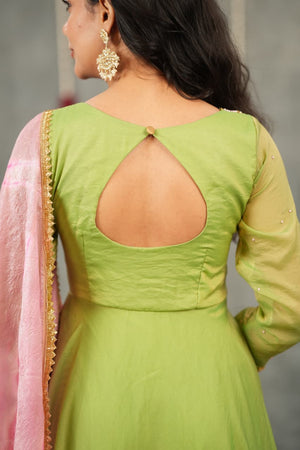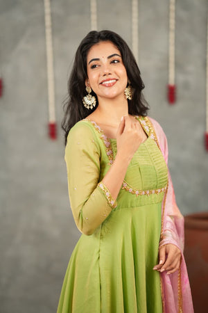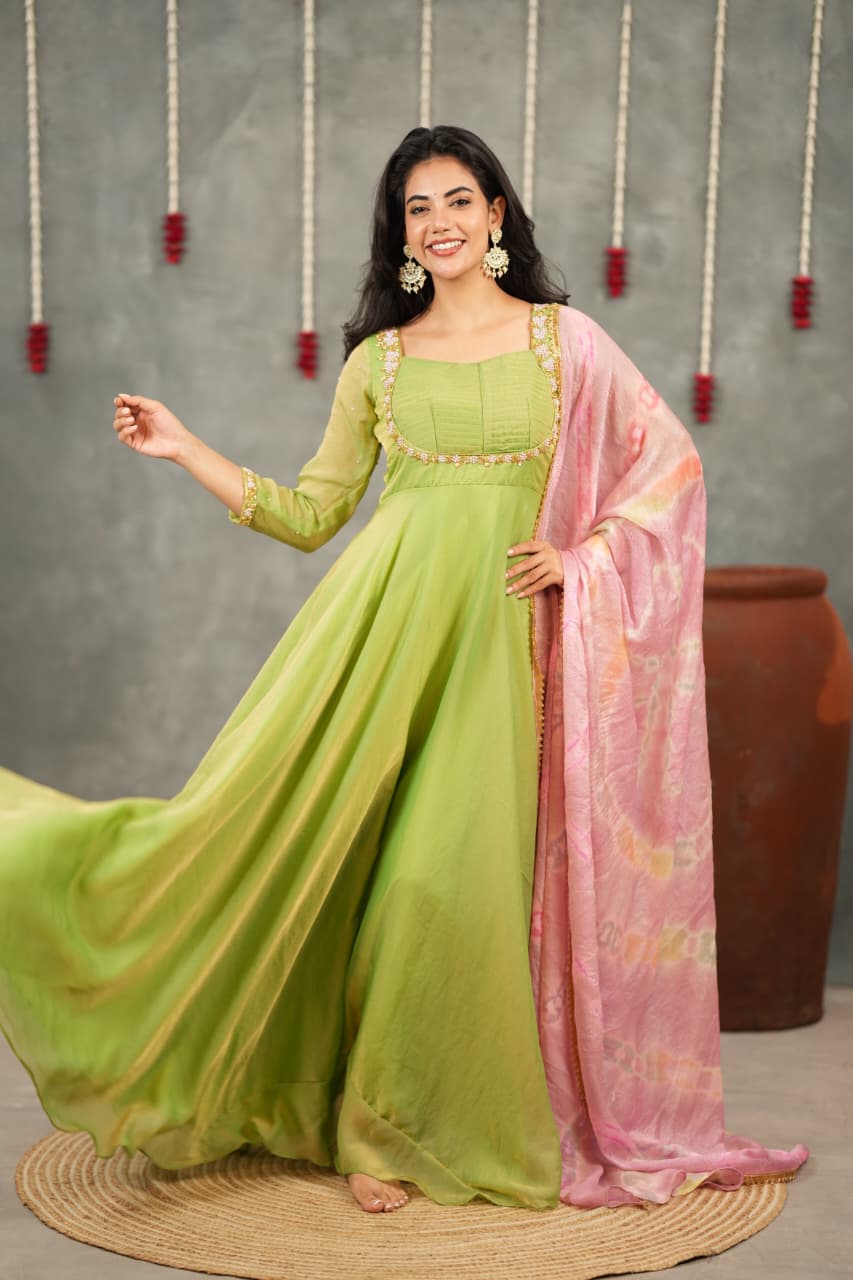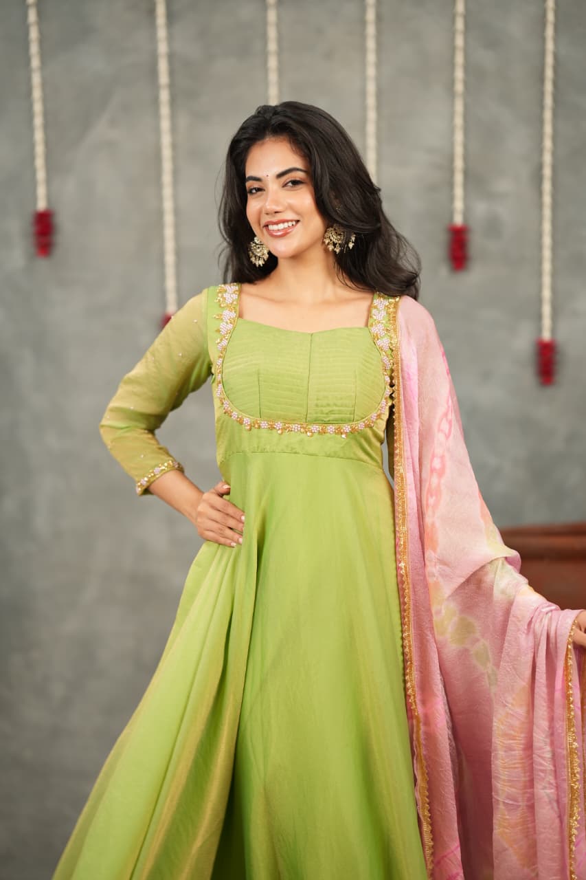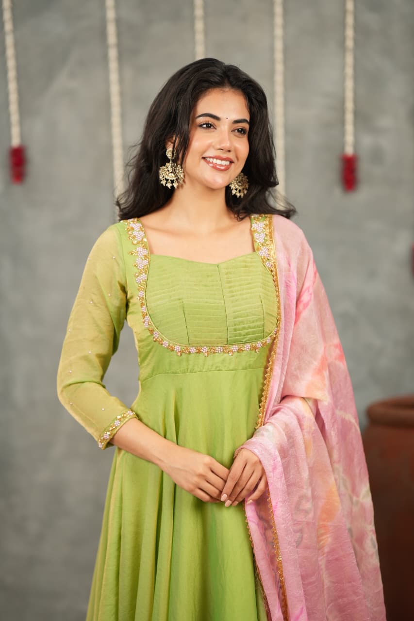 Crafted from luxurious Fendi silk, the Anarkali features elegant hand embroidery along the neckline and sleeves, adding a soft festive sparkle. The smooth, flowy silhouette gives a refined and graceful look, perfect for traditional and special occasions.