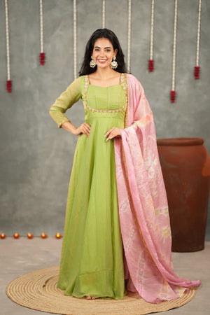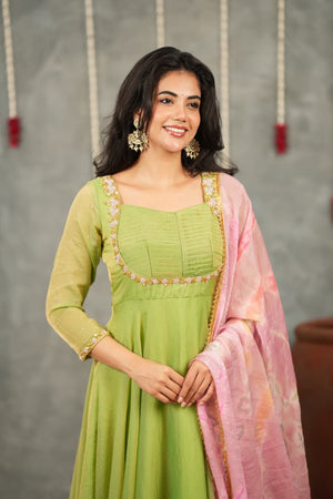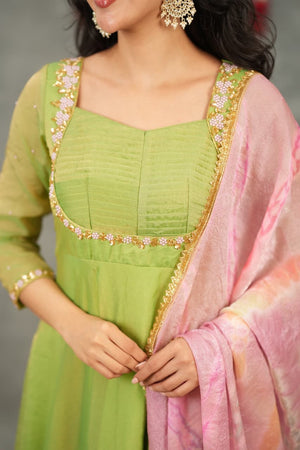 Comes with a beautifully crushed silk dupatta in soothing pastel tones, offering a lightweight drape and a dreamy, feminine finish that completes the outfit effortlessly.