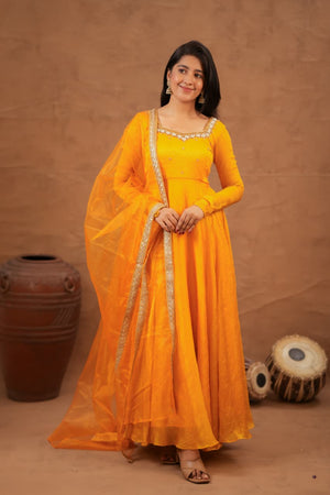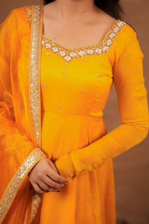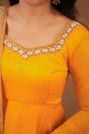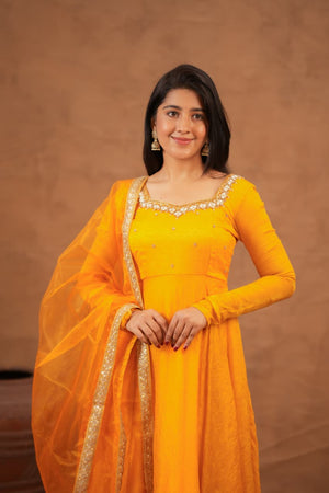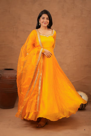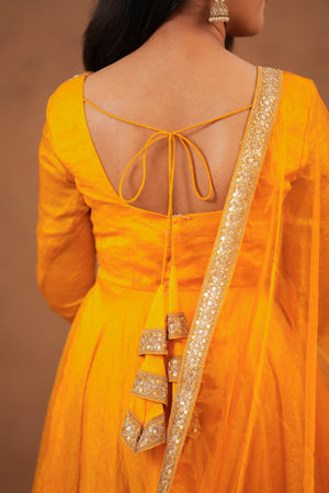 Paired with a matching sheer dupatta bordered in shimmer, this outfit blends traditional charm with a regal modern appeal. The vibrant sunshine hue makes it the perfect choice for haldi ceremonies, festive gatherings, weddings, and cultural celebrations.