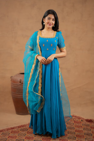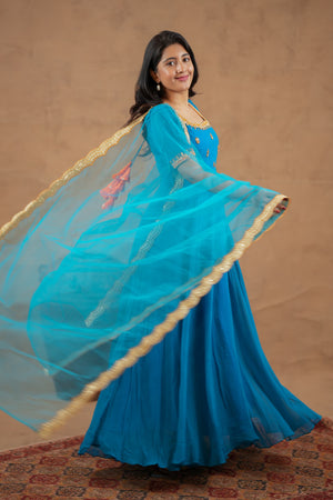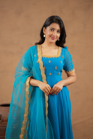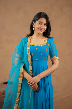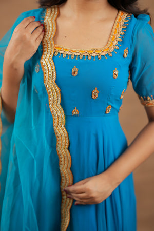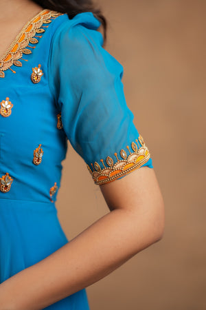 Drape yourself in the timeless charm of the Varnika Collection, crafted from flowy georgette fabric that moves like poetry. The outfit features intricate hand embroidery across the yoke and sleeves, blending tradition with refined modernity.